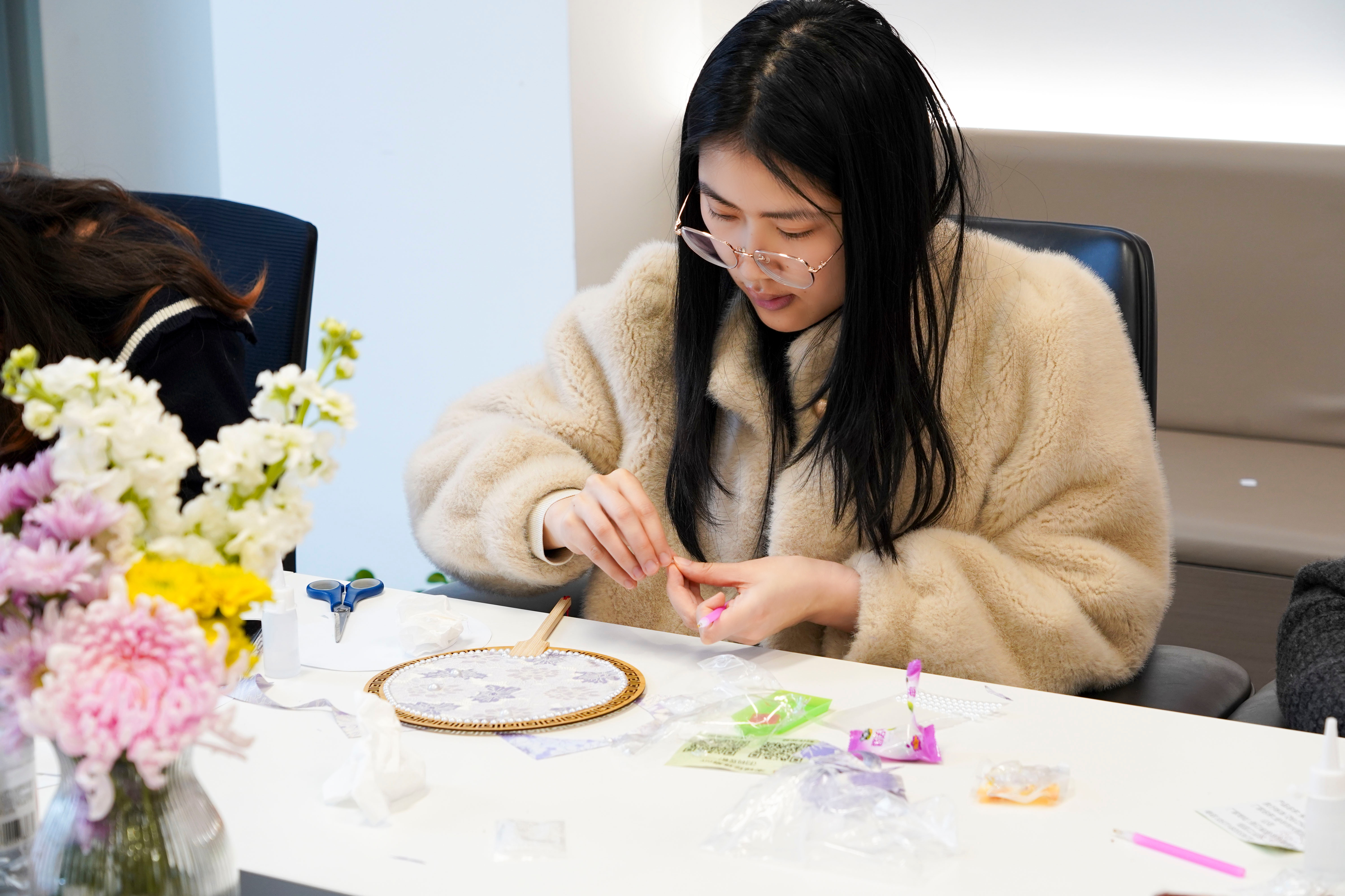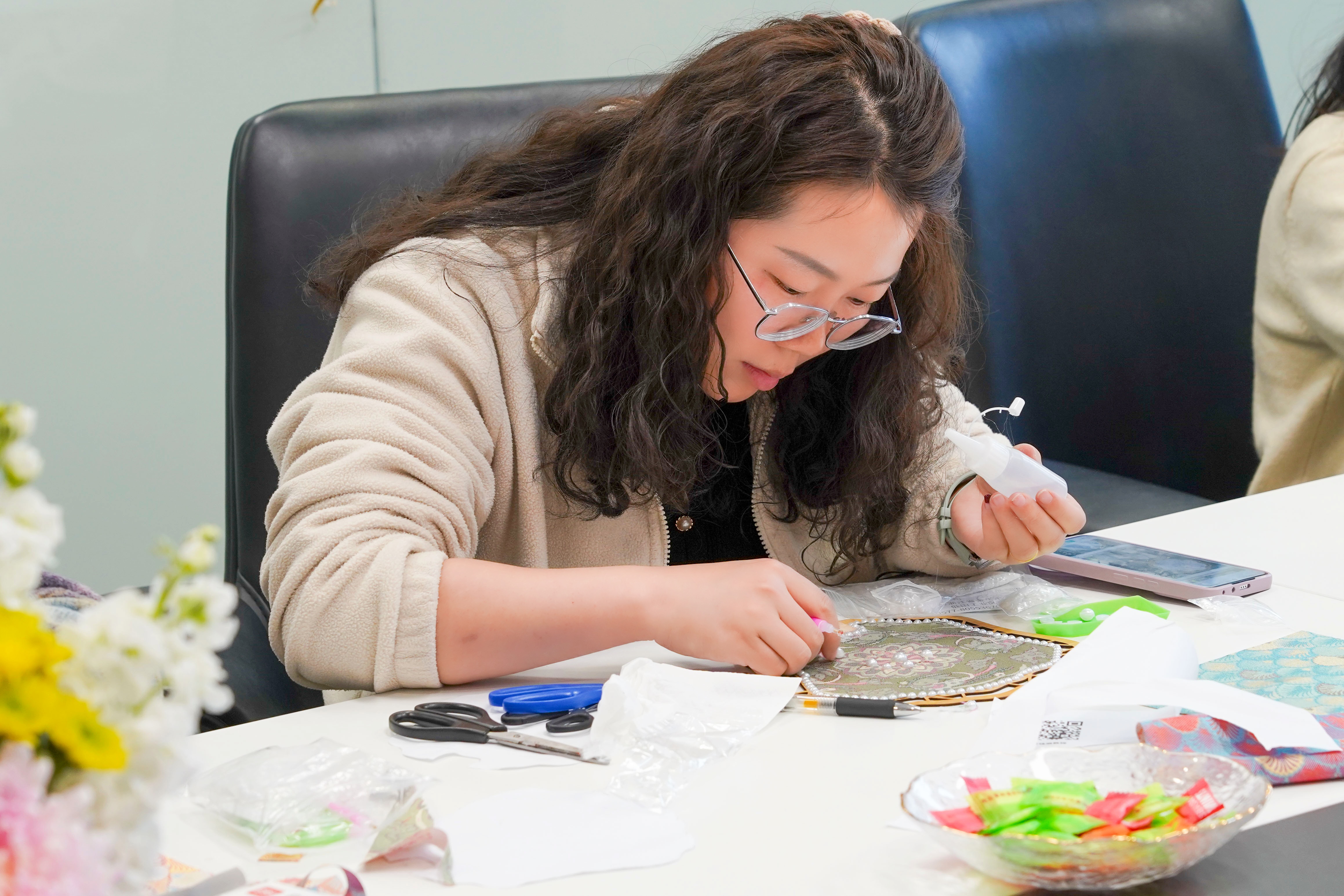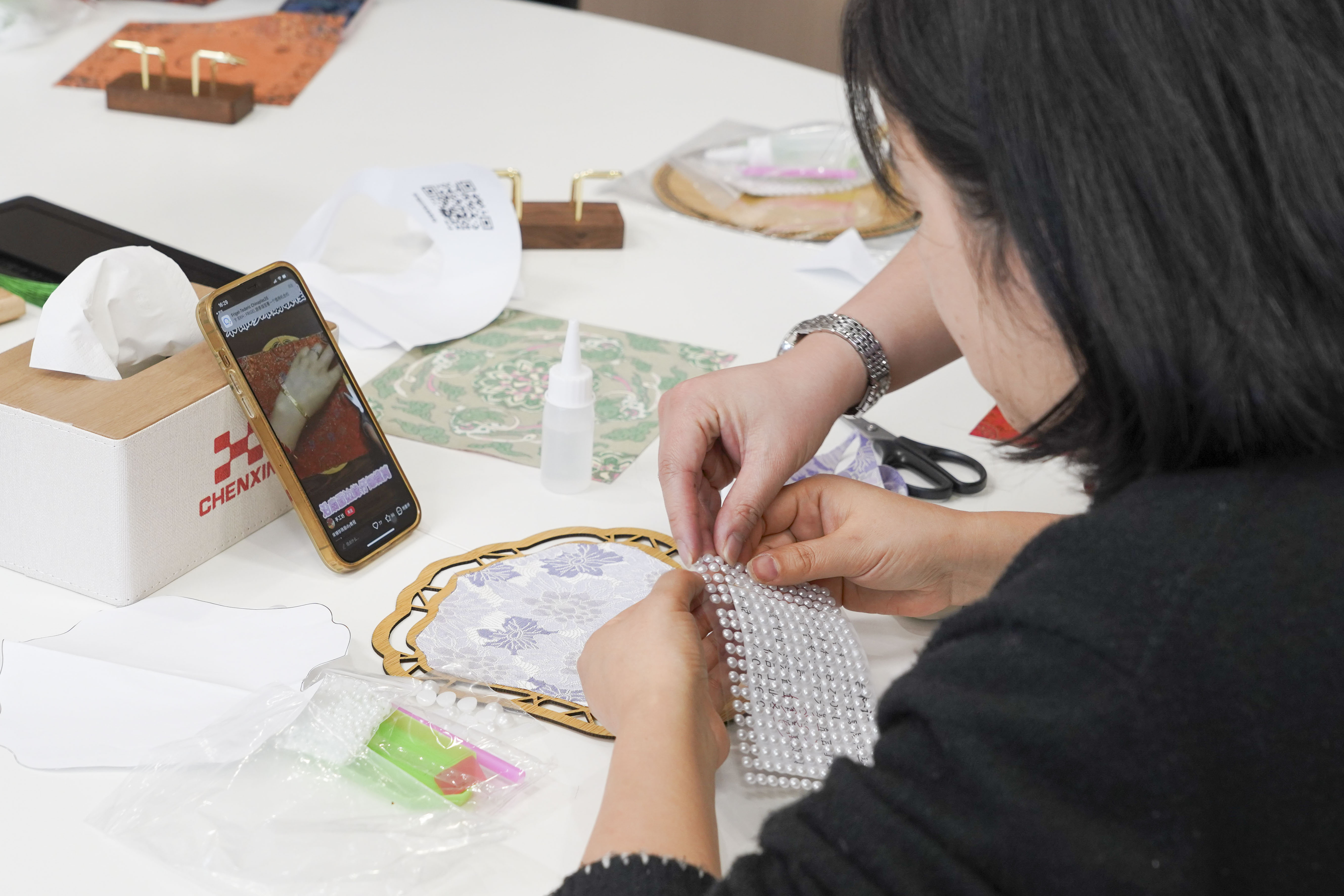Picking up a strand of brocade thread and adding a few bright pearls, everyone, while threading and sewing, feels the warmth of traditional craftsmanship and enjoys this rare focus and tranquility.